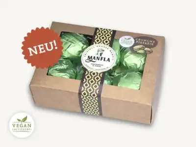 Die knackig-zarte Manfla mit Suchtfaktor. Unsere vegane Crunchy Pistazie Manfla vereint sanfte dunkle Bio-Schokolade mit einer unwiderstehlichen cremig-crunchigen Pistazien Füllung. Wir verwenden einen hohen Anteil an Pistazien, reine Kakaobutter, moderat Zucker, Weizen und andere natürliche hochwertige Zutaten. Da es für Veganer wenige Desserts gibt, haben wir diese 100 % vegane und laktosefreie Köstlichkeit kreiert. Ein herrlicher und natürlicher Genuss.